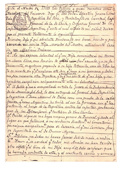 Antes de morir legó a Rosas su sable corvo que lo había acompañado en tantas batallas: "El sable que me ha acompañado en toda la guerra de la independencia de la América del Sud, le será entregado al General de la República Argentina, Don Juan Manuel de Rosas, como una prueba de la satisfacción que como argentino he tenido, al ver la firmeza con que ha sostenido el honor de la República contra las injustas pretensiones de los extranjeros que trataron de humillarla", dejó escrito en su testamento.